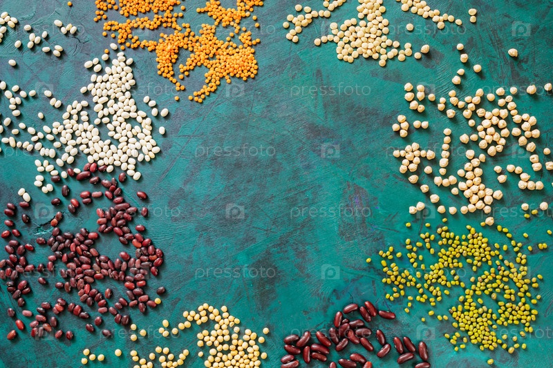 Рамка из разбросанных бобов на изумрудном фоне с копией пространства посередине