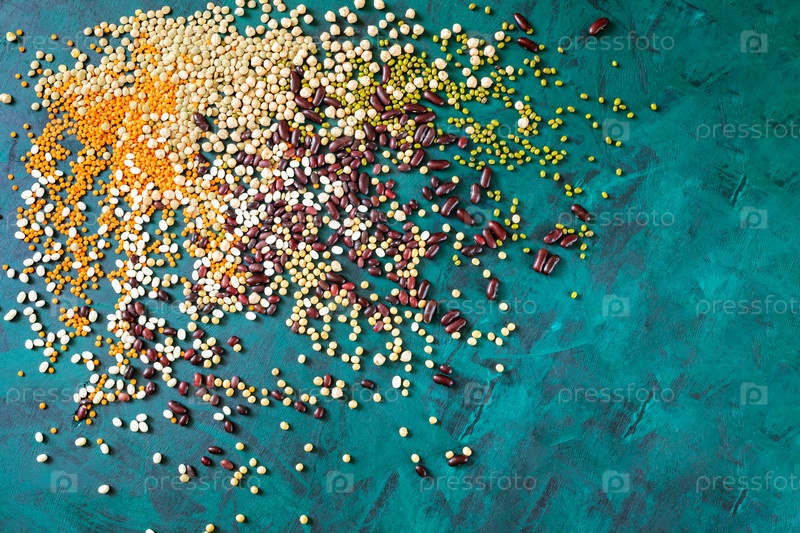 Куча разбросанных бобов на изумрудно-зеленом фоне с копией пространства