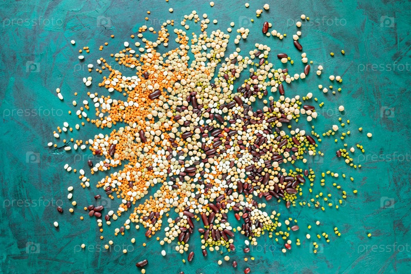 Различные бобы разбросаны от центра изумрудно-зеленого фона. Вид сверху