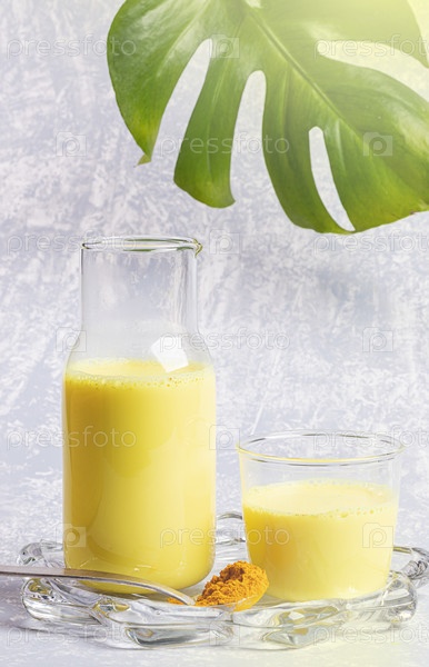 Органическое молоко с куркумой. Бутылка и стакан с золотым молоком на фигурной прозрачной тарелке. Светло-серый фон, лист монстера