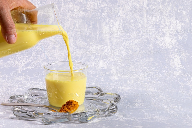 Органическое молоко с куркумой для иммунитета. Женская рука наливает золотое молоко из бутылки в стекло на светло-сером фоне