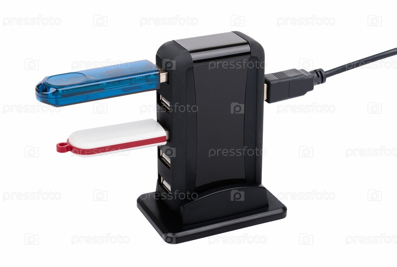 Черный USB-концентратор с двумя флешками, изолированными на белом фоне, небольшая глубина резкости