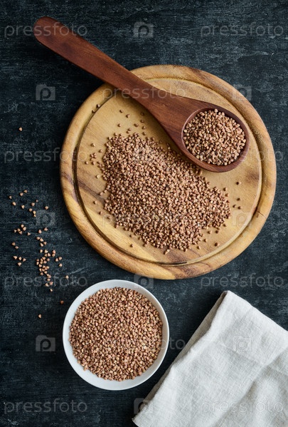 Гречка на разделочной доске, в деревянной ложке и керамической миске, древнее зерно без глютена для здорового питания, плоская кладка