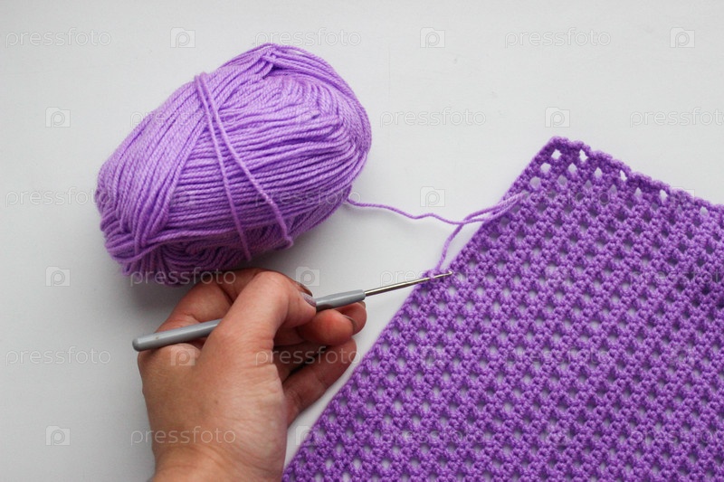 Клубок пряжи, крючок в руке и кусок трикотажного полотна