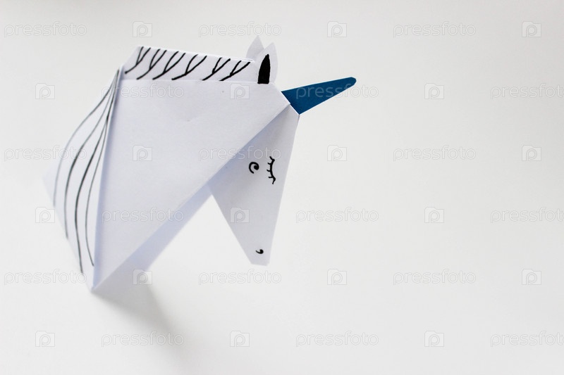 Белый единорог выполненный в технике оригами в левой части фото на белом фоне. С местом для вашего текста