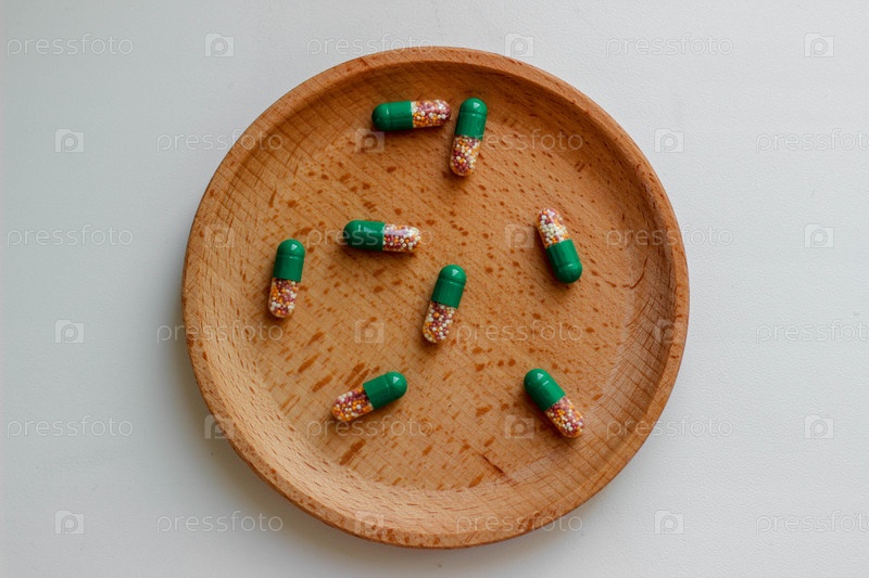 Растворимые в кишечнике капсулы с витаминами на деревянной тарелке. Здравоохранение, медицина. Вид сверху