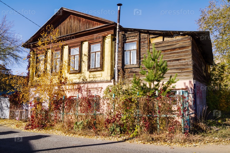 Старый деревянный дом. Солнечный осенний день в городе. Снимок сделан в России, в Оренбурге