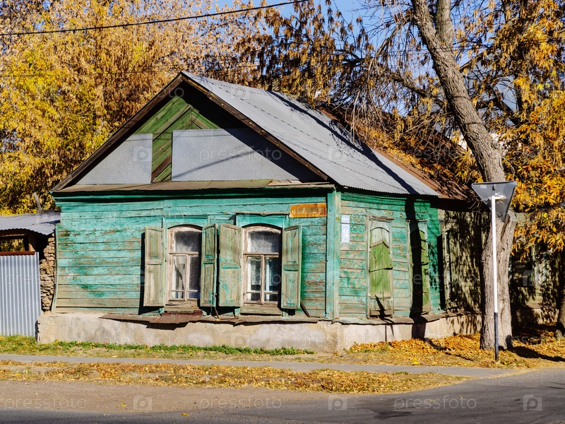 Старый деревянный дом. Солнечный осенний день в городе. Снимок сделан в России, в Оренбурге