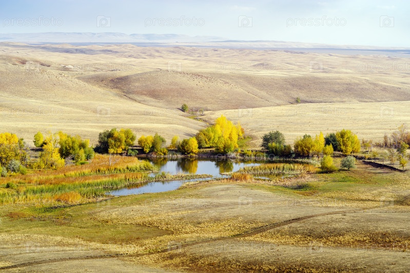 Осенний пейзаж с прудом на степной реке. Снимок сделан в России, в Оренбургской области
