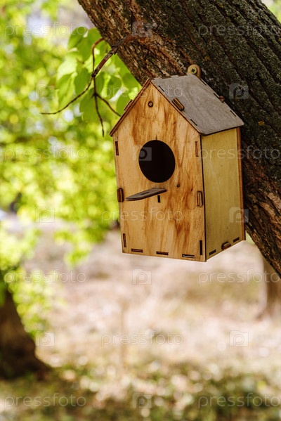 Деревянный скворечник, прикрепленный к стволу дерева в городском парке. Снимок сделан осенью в России, в городе Оренбург