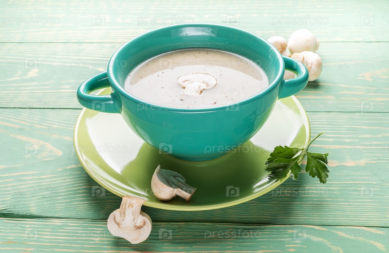 Бирюзовая керамическая миска с грибным крем-супом, свежими грибами и петрушкой на зеленой тарелке на зеленом деревянном фоне