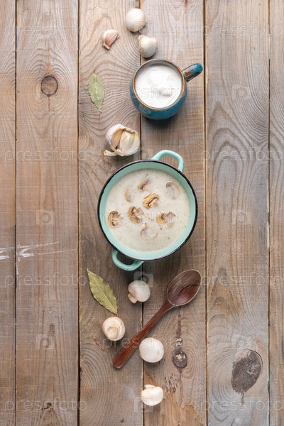 Вертикальное расположение бирюзовой керамической сковороды с грибным крем-супом и ингредиентами на деревянном фоне