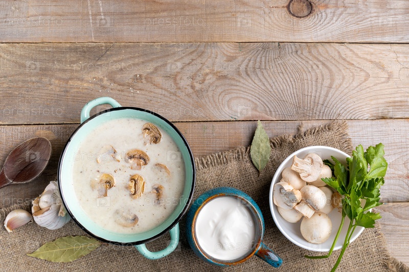 Бирюзовая керамическая сковорода с грибным крем-супом, чашка со сметаной, миска со свежими шампиньонами, ложка и специи на мешковине на деревянном фоне