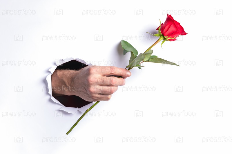 Рука человека держит одну красную розу через рваную дыру в стене из белой бумаги