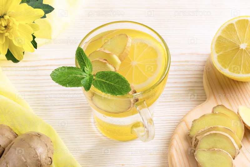 Стакан воды с лимоном и имбирем на светлом деревянном столе