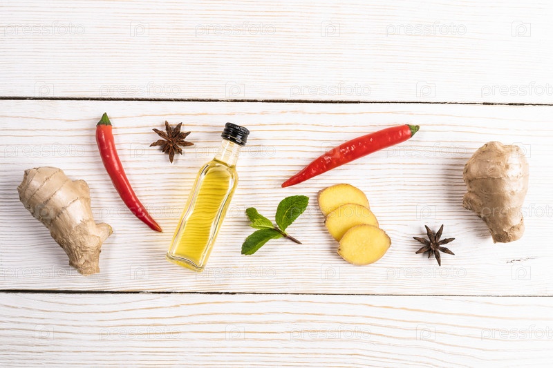 Макет приправ с имбирем и имбирным маслом на светлом деревянном фоне