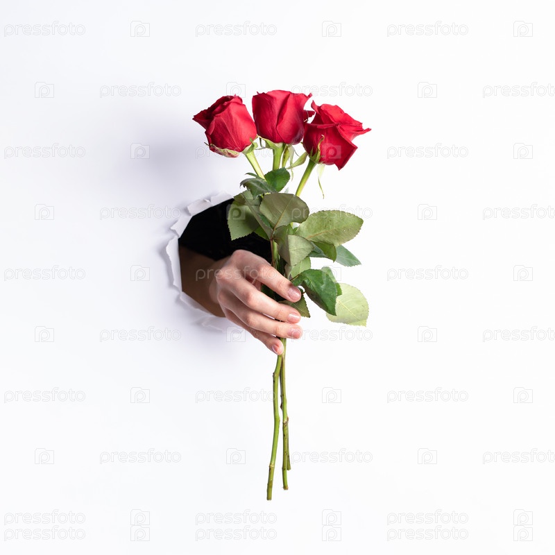 Женщина держит букет из трех красных роз через рваную дыру в стене из белой бумаги