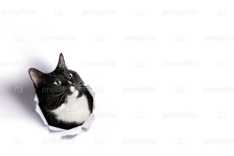 Черно-белая голова кота в дыре в белой бумаге и удивленно смотрит вверх