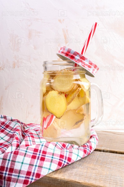 Стеклянная банка с имбирной водой с соломинкой и красной клетчатой шапкой на красной клетчатой ткани на деревянных досках на светлом фоне