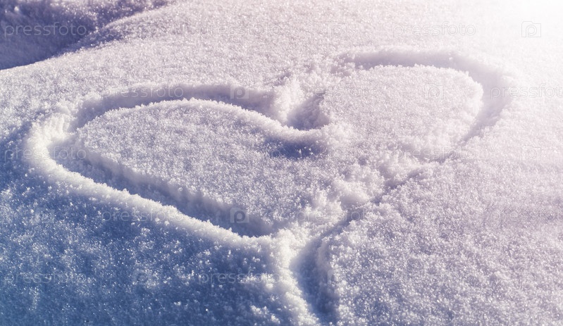 Большой рисунок сердца на белом снегу с зимним солнечным светом. Концепция дня святого Валентина. Крупным планом
