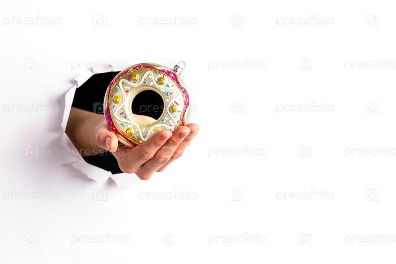 Женская рука протягивает декоративную рождественскую игрушку - красочный стеклянный пончик через круглое рваное отверстие в белой бумаге