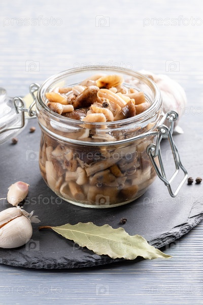 Открытая стеклянная банка с домашними маринованными лесными опятами на сланцевой доске. Ферментированная пища. Вертикальная ориентация