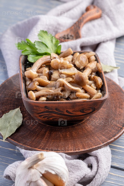 Керамическая коричневая миска, полная маринованных опят на серой салфетке на сером деревянном столе. Ферментированная пища. Вертикальное фото