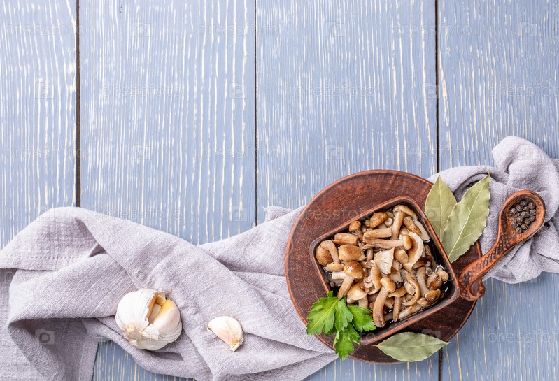 Керамическая коричневая миска с маринованными лесными опятами и специями на серой салфетке на сером деревянном столе. Ферментированная пища