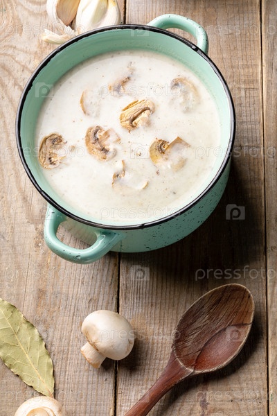 Бирюзовая керамическая сковорода с грибным крем-супом, свежими шампиньонами, ложкой, чесноком и лавровым листом на деревянном фоне
