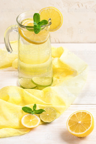 Стеклянный графин с водой, настоянной на лимоне и лайме, на желтой ткани на светлом деревянном столе