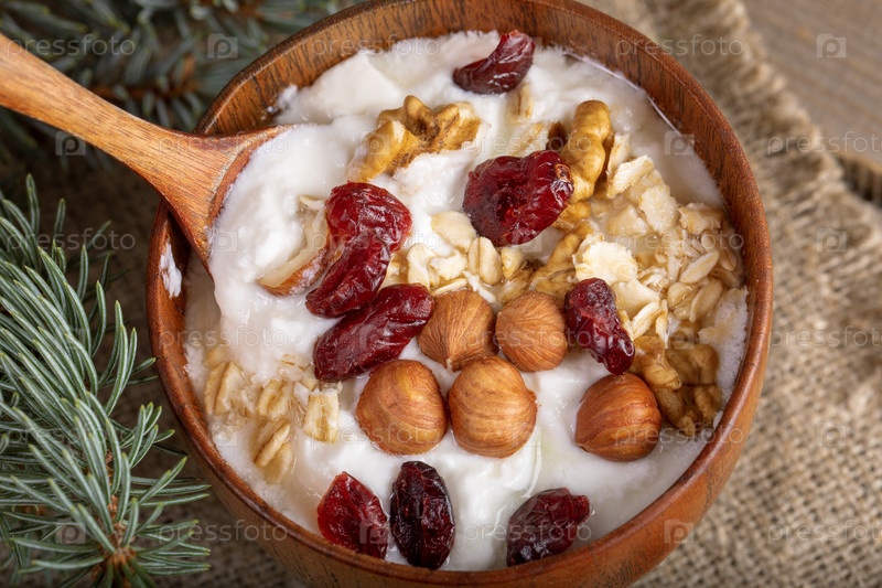 Деревянная миска крупным планом с йогуртом с овсяными хлопьями, орехами и сушеной клюквой на мешковине