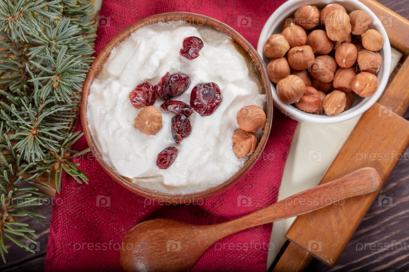 Деревянные и керамические миски с йогуртом и орехами на красной салфетке на деревянном столе