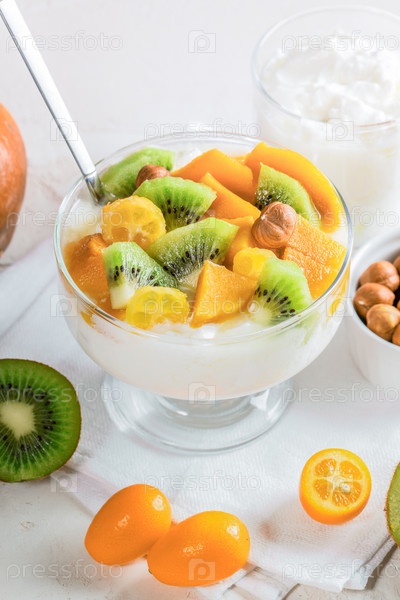 Стеклянная чаша крупным планом с йогуртом и фруктами на белой салфетке