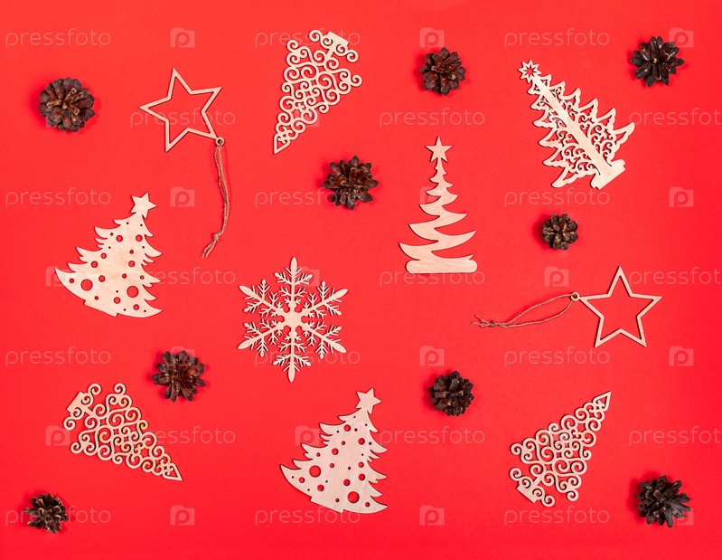 Праздничная рождественская планировка деревянных украшений и сосновых шишек на красном фоне. Рождество без отходов