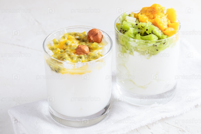 Крупным планом два стакана с йогуртом и пюре из свежих фруктов стоят на белом столе