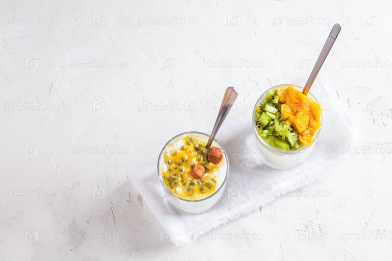 Два стакана с йогуртом и фруктовым пюре и с металлическими ложками стоят по диагонали на белом фоне