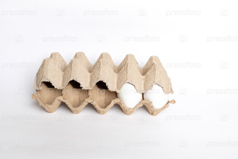 Полупустая картонная коробка с белыми яйцами на белом фоне