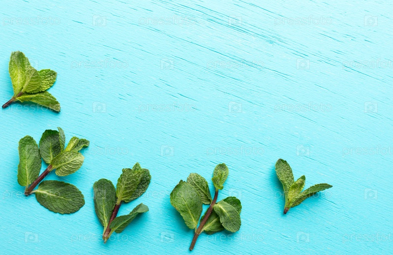 Пять веточек зеленой мяты раскладываются в виде дуги на бирюзовом фоне