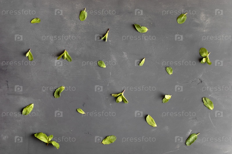Узор из зеленых веточек и листьев мяты на сером фоне
