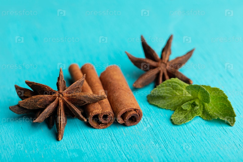 Палочки корицы с веточкой мяты и анисовыми звездами на бирюзовом фоне