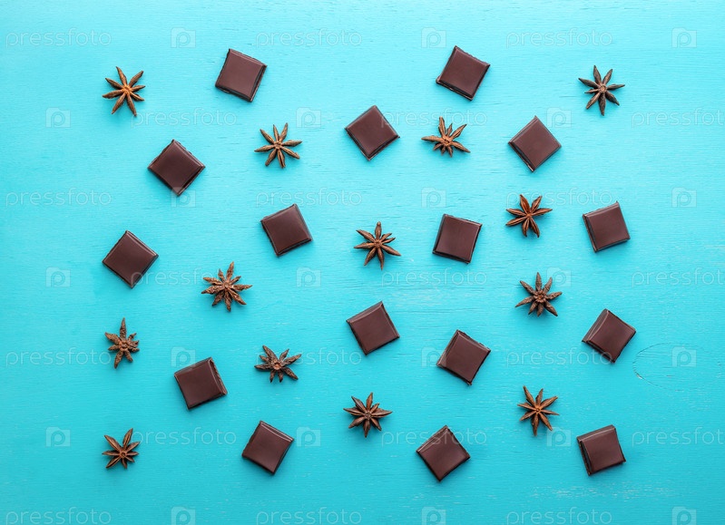 Узор из кусочков шоколада и анисовых звезд на бирюзовом фоне