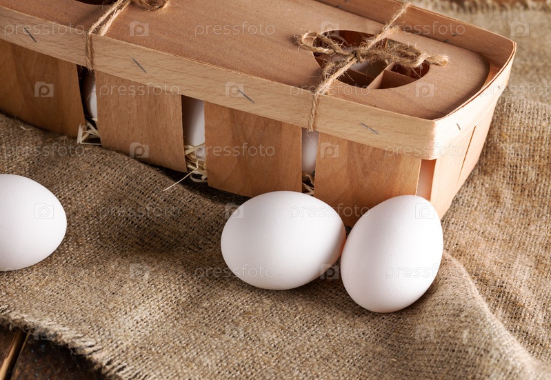Белые яйца крупным планом в экологически чистой деревянной упаковочной коробке и на мешковине