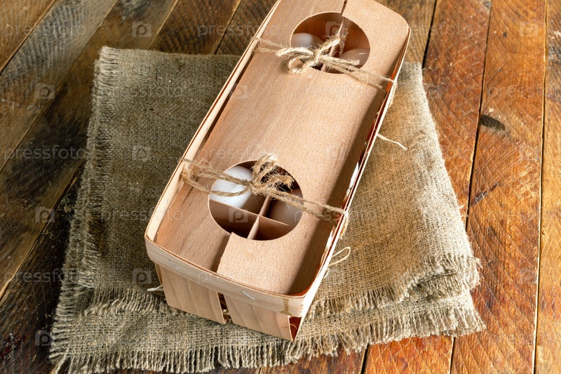 Закрытый целый экологически чистый деревянный ящик с яйцами на мешковине на деревянном столе