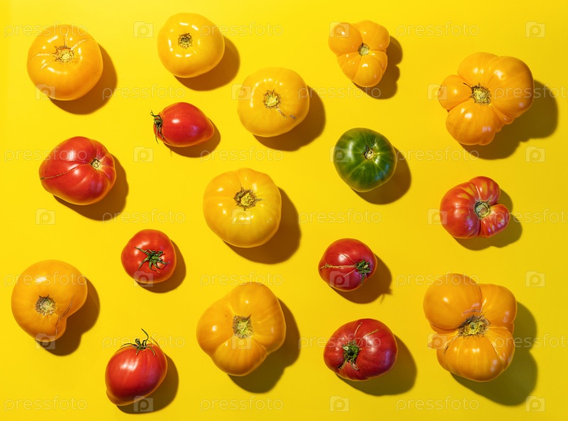 Узор из фермерских помидоров разных цветов и размеров с жесткими тенями на ярко-желтом фоне