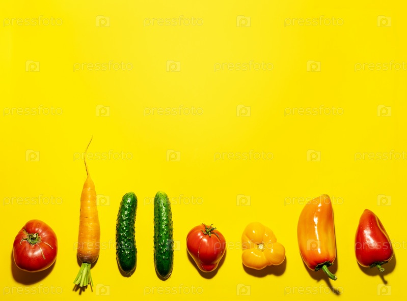 Свежие овощи с фермы выложены в ряд в нижней части ярко-желтого фона. Вид сверху, пространство для копирования