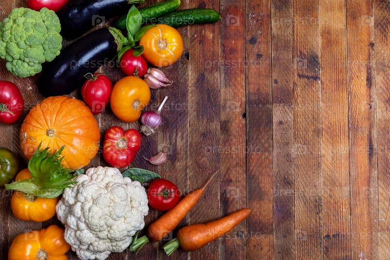 Сбор свежих сельскохозяйственных овощей на старом деревенском выдержанном винтажном деревянном столе. Посмотреть выше. Копировать пространство