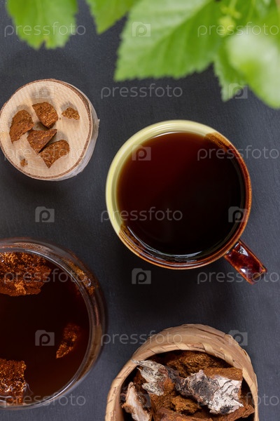 Целебный напиток из чаги из березового гриба в керамической чашке и стеклянной банке, кусочки чаги на черном. Вид сверху, вертикальное фото