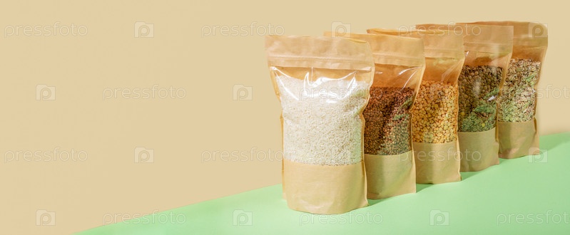 Бумажно-целлофановые пакеты с крупами стоят по диагонали на бежево-зеленом. Ноль отходов. Никакого пластика. Баннер, место для копирования