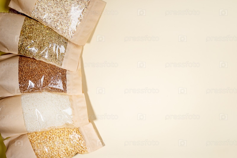 Бумажные целлофановые пакеты с крупами, крупным планом бобовых на бежевом. Скопируйте пространство. Запас на черный день. Запас на карантин