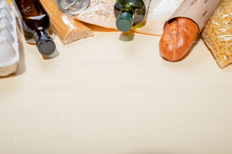 Запас продуктов питания в экологически чистой бумаге, целлофане, стеклянной упаковке, выложенной на бежевом фоне. Скопируйте пространство